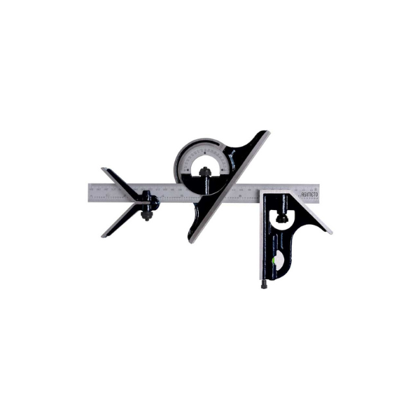 Asimeto 7490208 4pc 12"/300mm Combination Square Set with blade (7910051), square head (7490270), centre gauge (7490250), and dial scale protractor head (7490260).